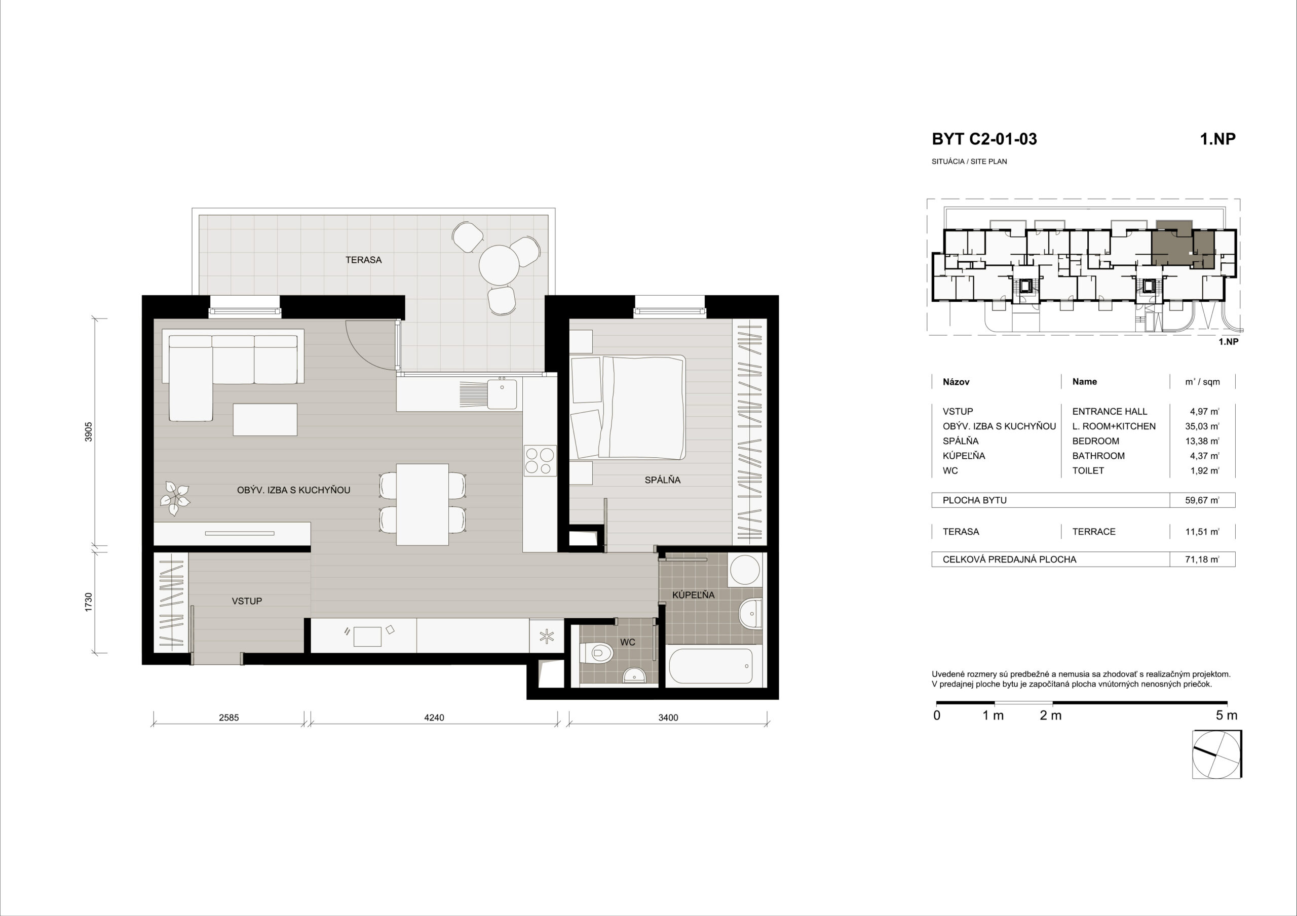 BYT C2-01-03 na 1NP v Domino Parku je ideálnym miestom pre tých, ktorí hľadajú moderné a komfortné bývanie v blízkosti centra mesta. Byt má celkovú rozlohu 71,18 m2 a disponuje 1 spálňou, obývacou izbou s kuchynským kútom, terasou , kúpeľňou a wc. Bytový dom je vybavený modernými technológiami a ponúka širokú škálu služieb pre rezidentov.